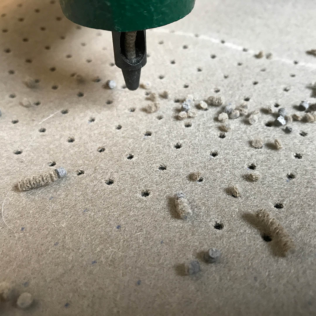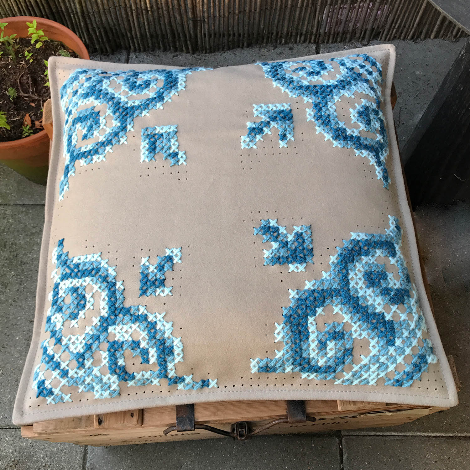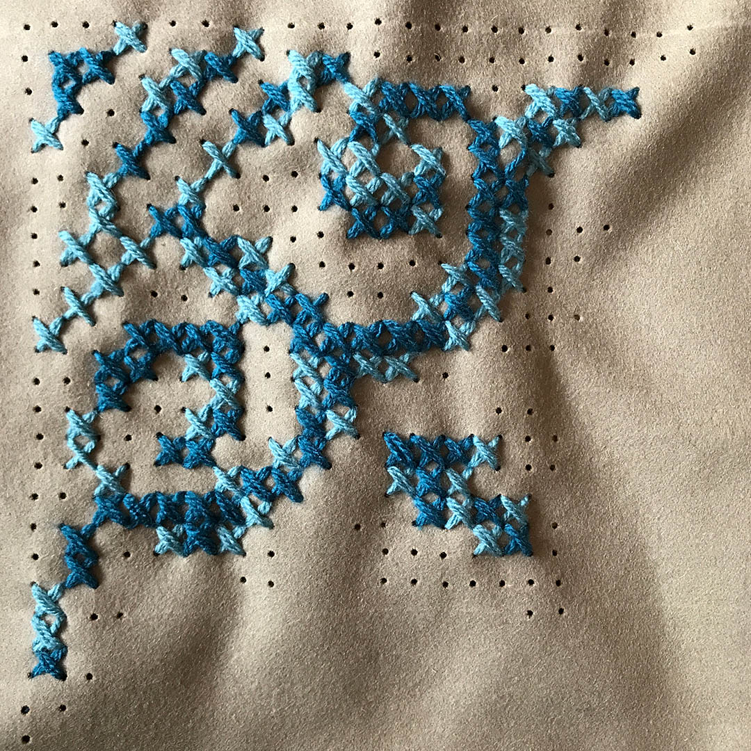 Voor mij staat kruissteek voor huiselijkheid, vilt voor warmte. Ik ponste expres ‘teveel’ gaatjes om de uniciteit van het kussen te benadrukken.
