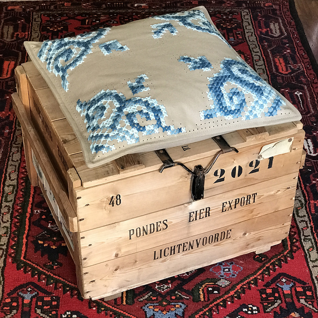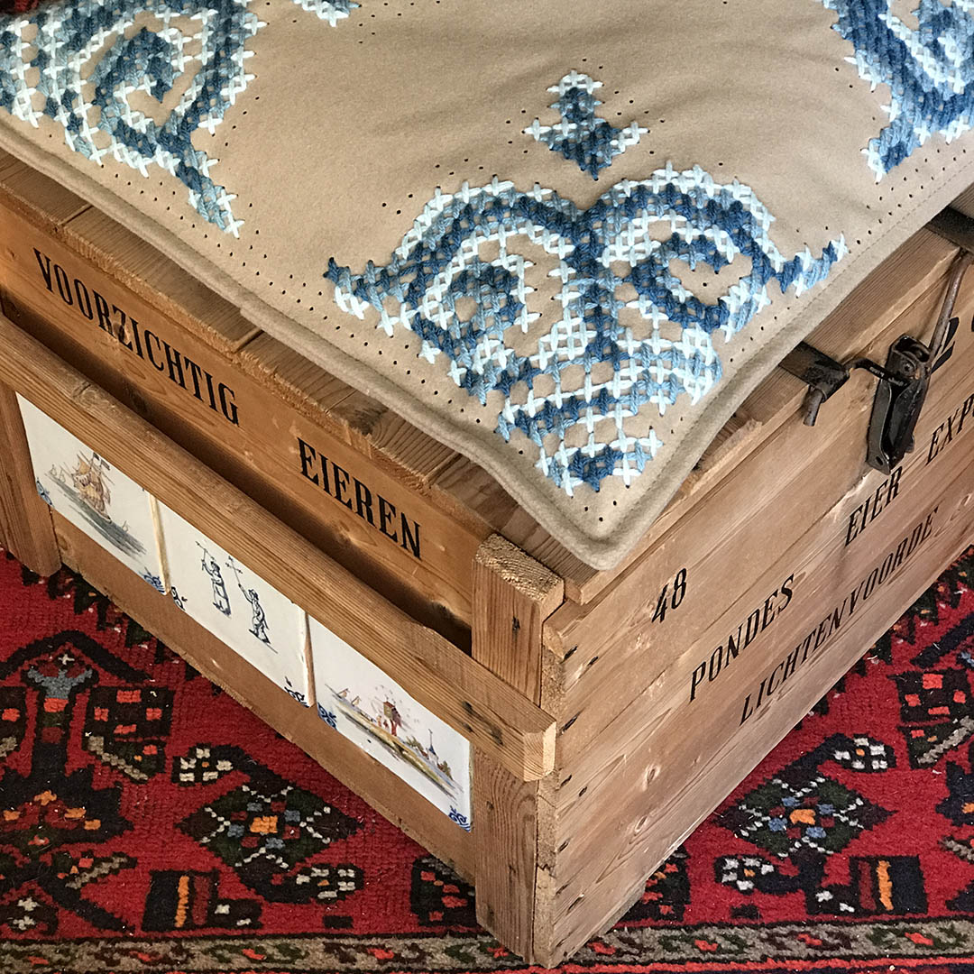 Verder wilde ik iets doen met het gevoel van gezelligheid, warmte en huiselijkheid dat Els heeft bij de herinneringen aan de keuken van thuis. Een groot zacht vilten kussen moest het worden voor op de eierkist, die dienst zou gaan doen als dekenkist in de nieuwe serre.